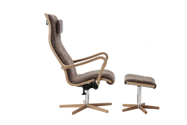 Furiren en moderniserad 1930-tals modell i fårskinnsklädsel. Denna modell har stoppning på sitsen för bättre komfort. Gung och snurr mekanismen gör att denna design fåtölj funkar i alla lägen. Med sitt infällda spår på ryggen hålls nackkudden på plats. Stolen signerad G A Berg. Alltid lika rätt. Alltid lika omtyckt.