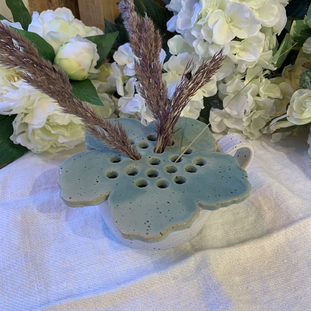 Handkavlad ”Blomhållare”. Använd tillsammans med en vas, ett glas, en skål eller en glasburk för att sätta blomstjälkarna i vardera hål.
